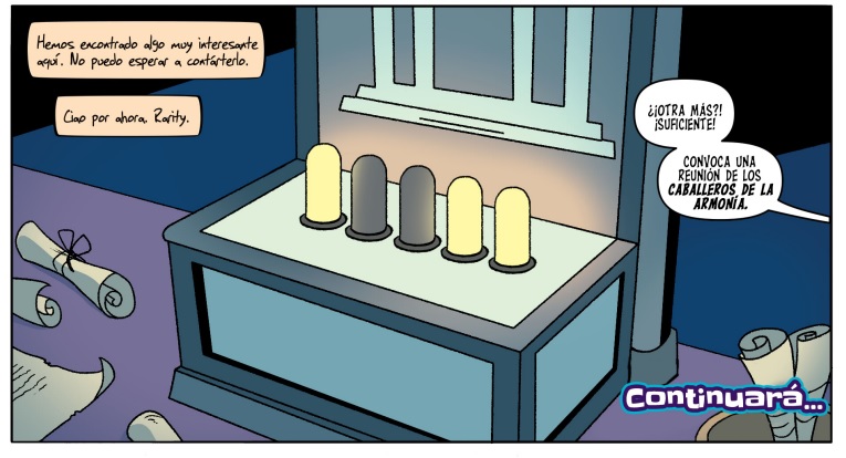 O POR CIERTO "Caballeros de la Armonía" no olvidemos que la escena final ya nos esta hablando de algo nuevo en la historia que en el de Zecora no mencionaron. ¿Qué será o quienes serán los Caballeros de la Armonía? ¿y por qué ''suficiente''? ¿es malo que los arboles de la armonía se activen? Además ''Caballeros de la Armonía'' suena a algo bueno por lo que tal vez no sea un villano este ser misterioso. Si leyeron la sinopsis del comic 100 lo sabremos en agosto por lo que quedan 3 meses.