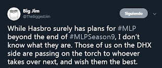 "Aunque Hasbro seguramente tiene planes para MLP más allá del final de la temporada 9, no sé lo que son. Aquellos de nosotros en el lado DHX están transmitiendo la antorcha a quien se tome el siguiente, y les deseamos lo mejor."